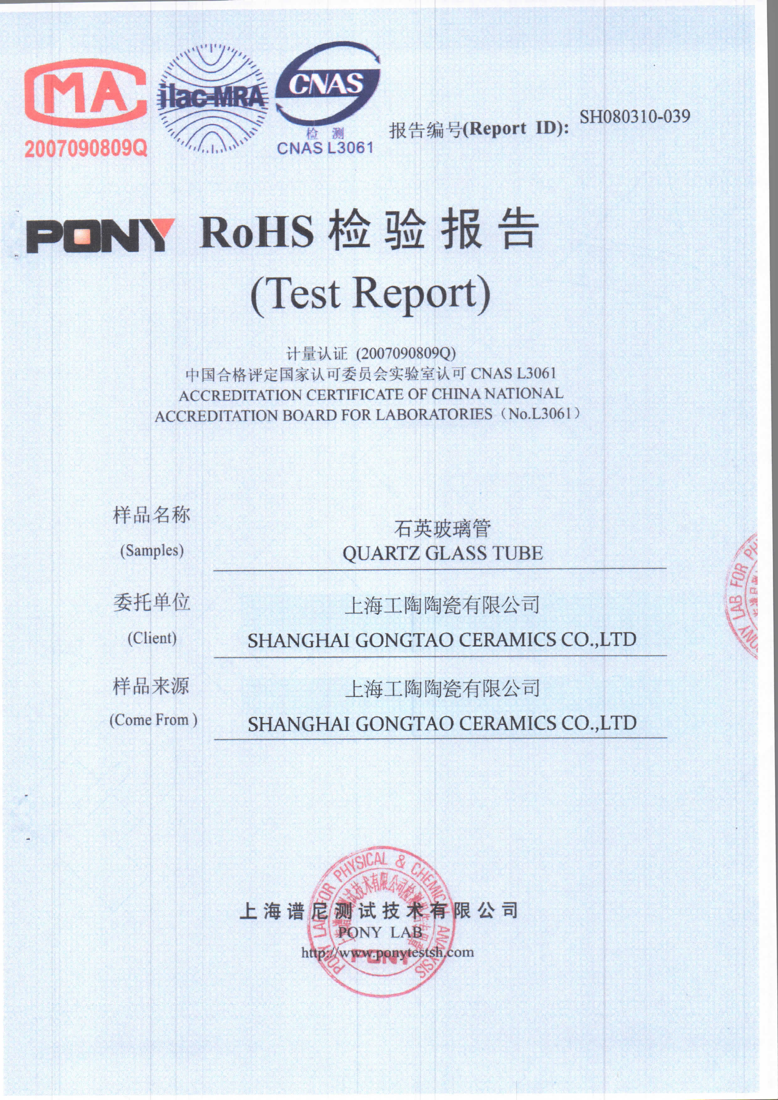 工陶产品检验报告-石英玻璃管