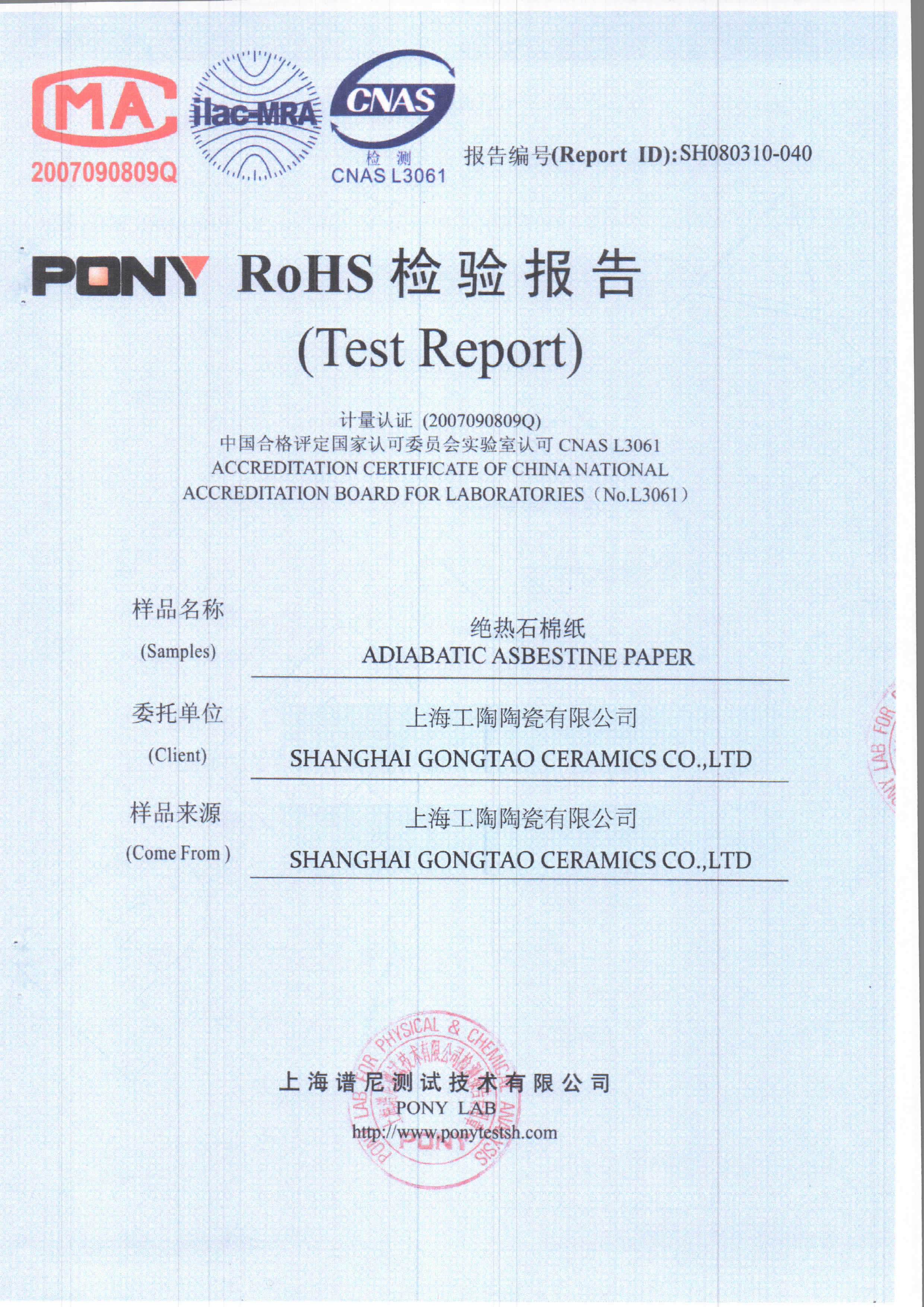 工陶产品检验报告-绝热石棉纸